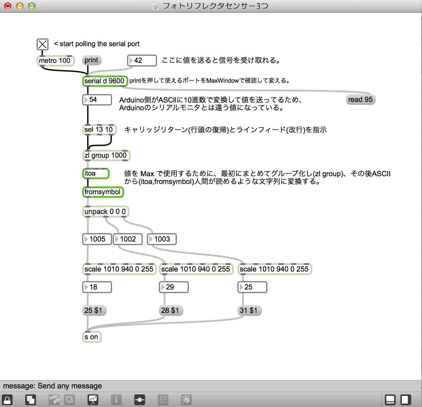 右のシリアルモニタを見ると分かりますが、3つのセンサーの値を1行に表示されるようにしています。