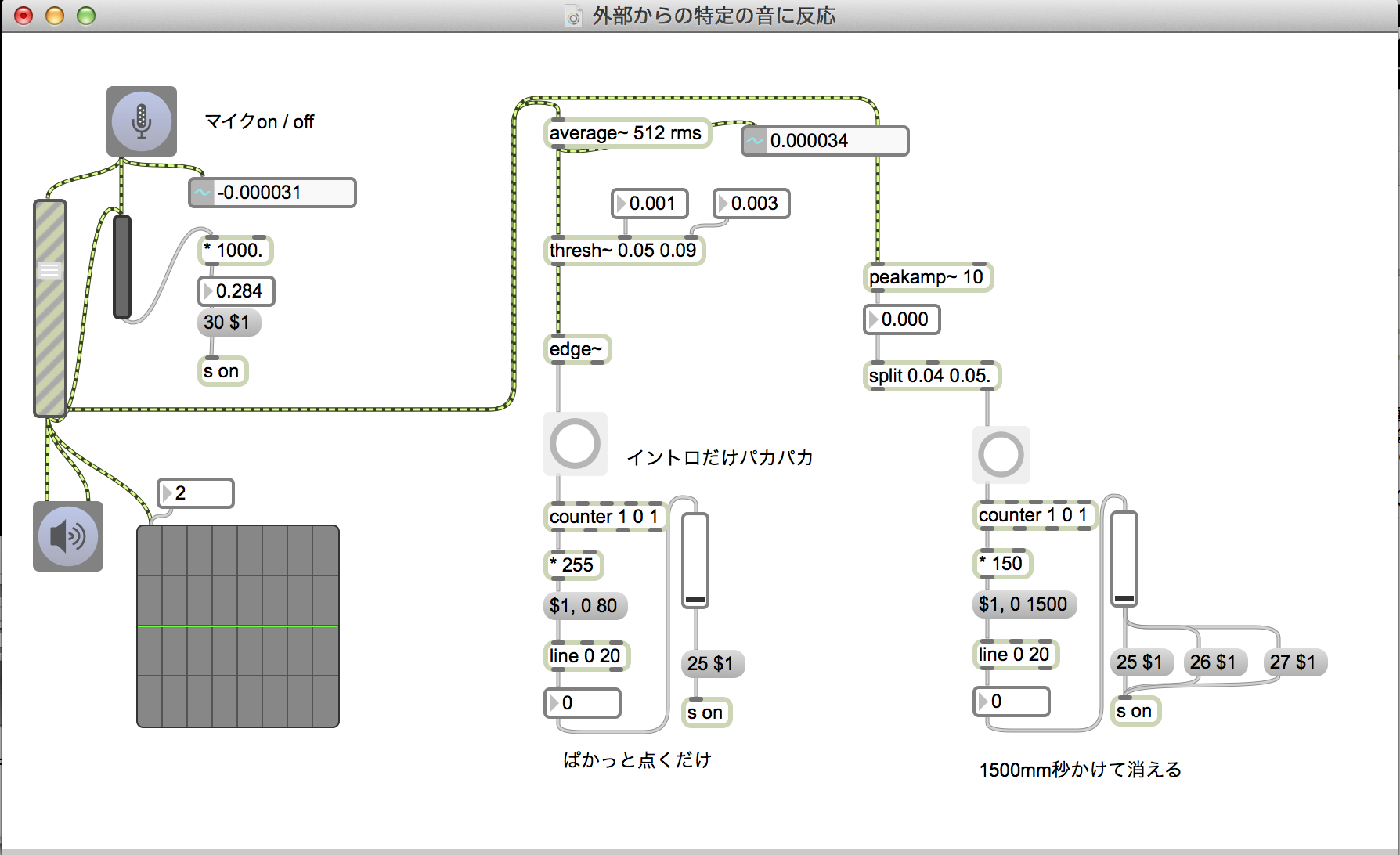 ・threshオブジェクトで0.03より大きい値がきた時に「1」を。0.01より小さい値がきた時に「0」が出力されるように設定。