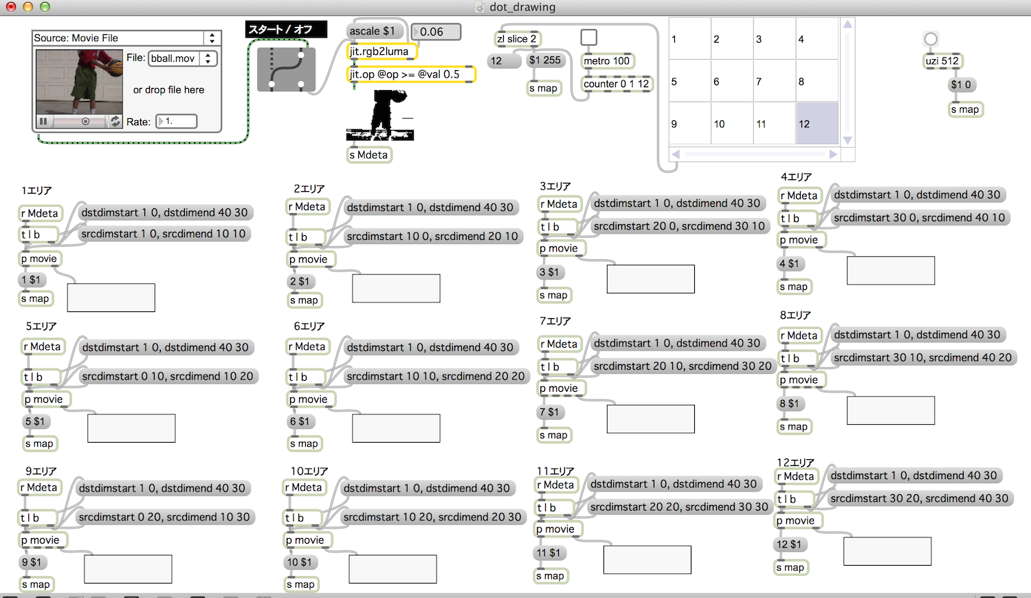 1番右側で表になってる所(jit.cellblock)が、なんちゃってお絵描きエリアです。
