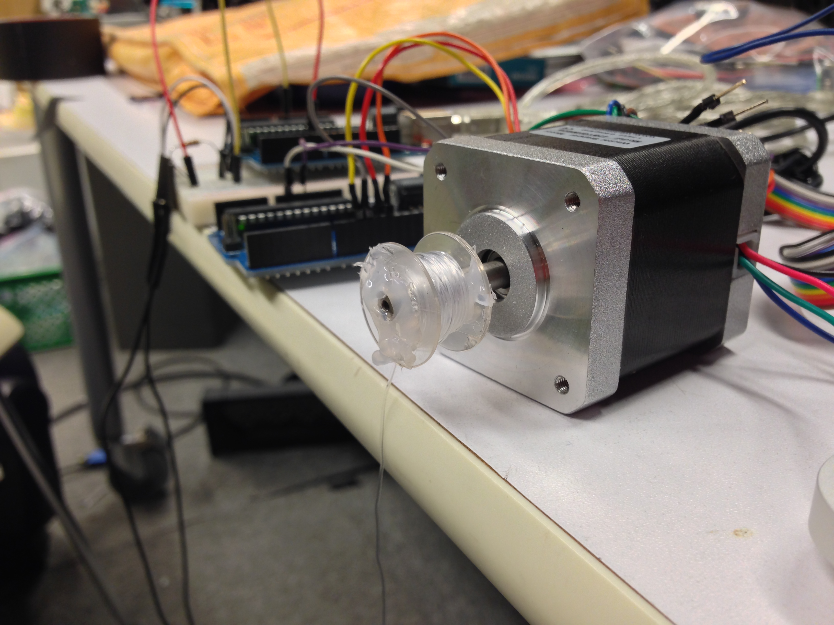 こんな感じで、ステッピングモーターに下糸ボビンを付けて巻き取ってます。