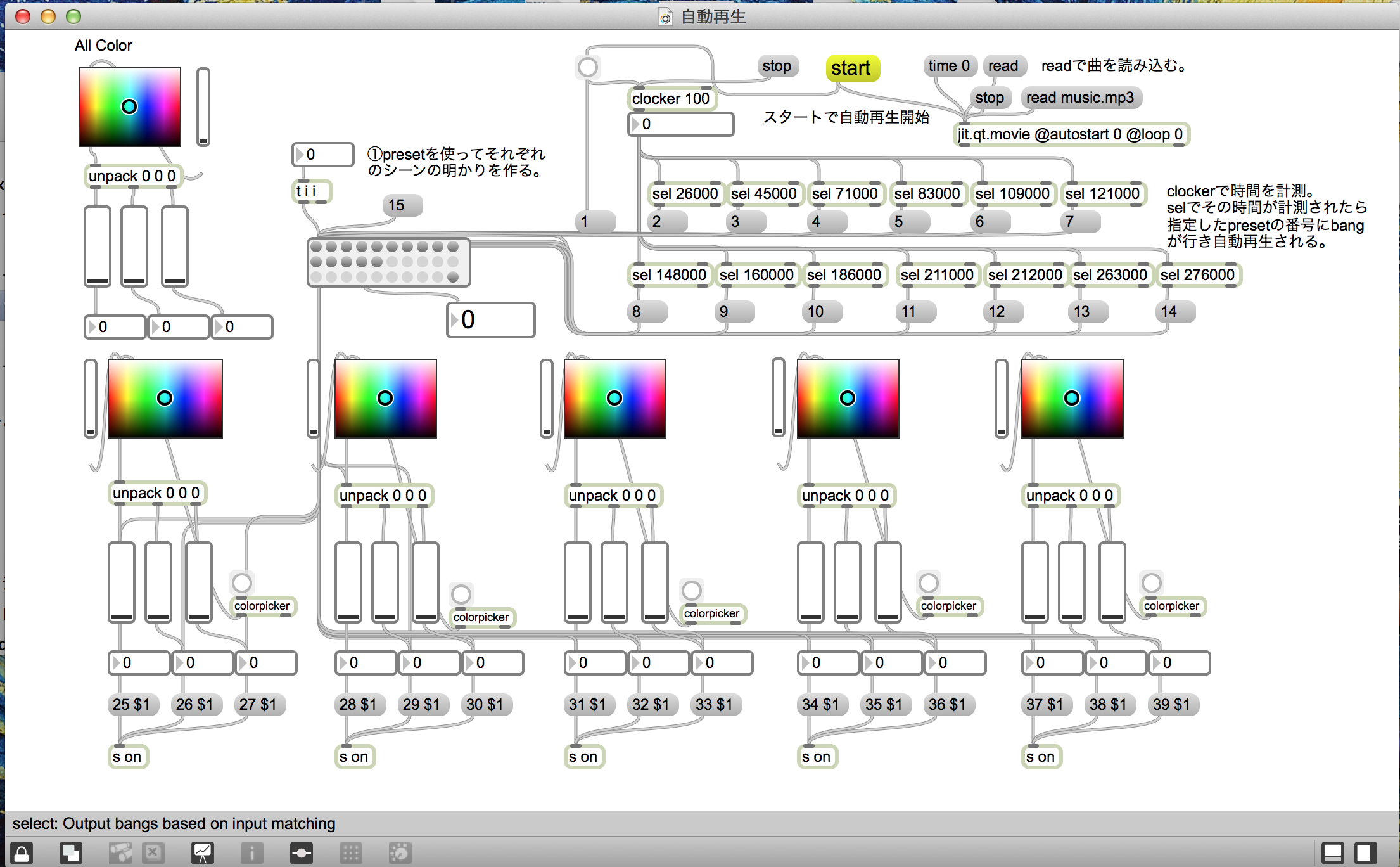 ・clockerとselオブジェクトを使って時間を計測し、その時間になったらそれぞれのpresetの番号にbangがいくようにする。