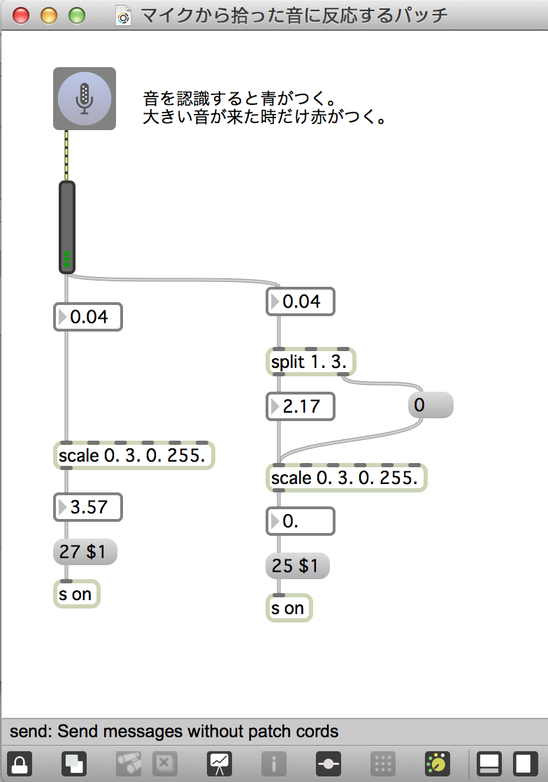 ・splitオブジェクトで、1.0~3.0の範囲(割と大きい音)が入力されたら赤が点くようにしてあります。